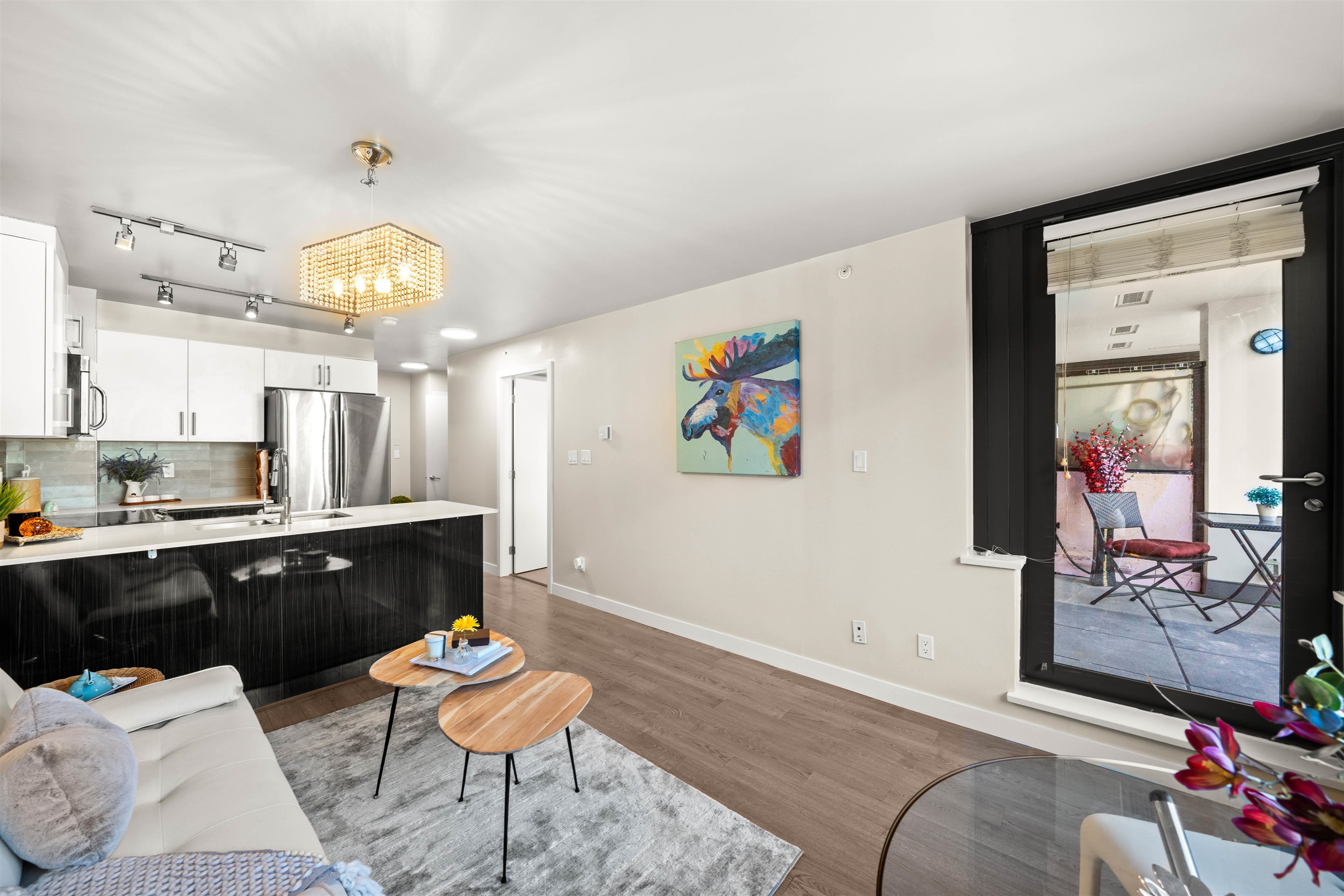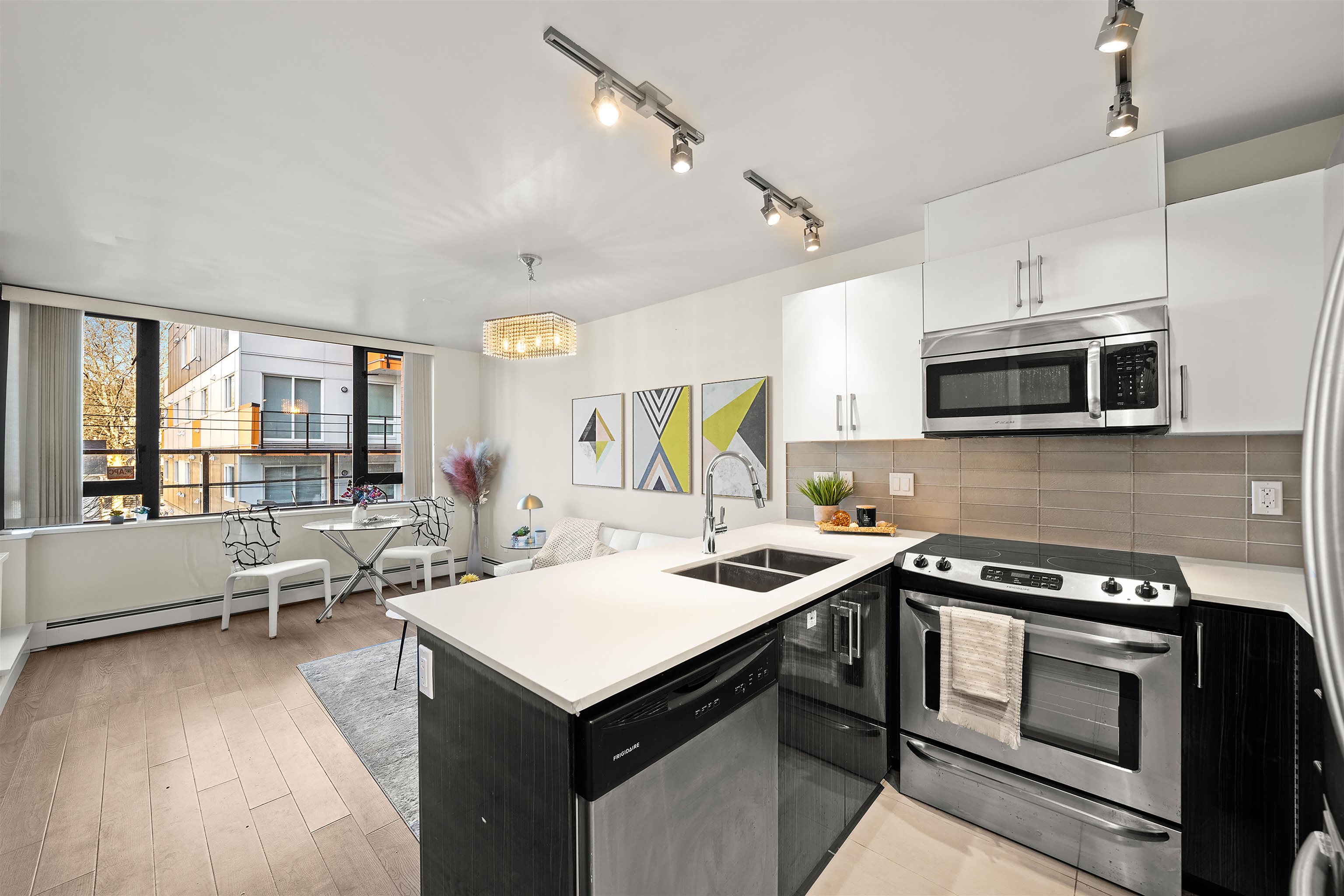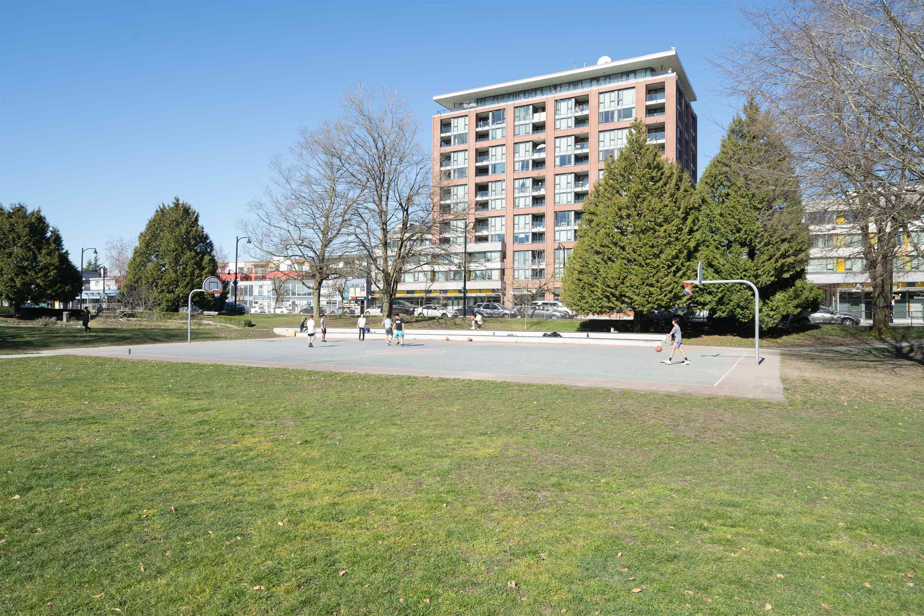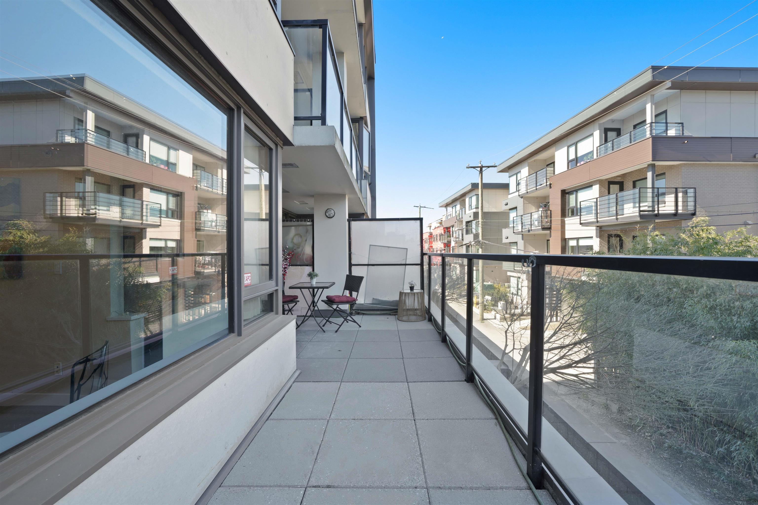 Prime location alert! This exceptional 1 bedroom, 1 den unit is QUIET and peaceful, situated away from the main road. Step onto the expansive balcony (181 sqft), perfect for entertaining guests and your own enjoyment, completing a total space of 715 sqft. The functional open layout showcases an excellent kitchen equipped with S/S appliances & Quartz countertops. New upgrades include freshly painted walls, new light fixtures, and newer laminate floors in the bedroom. Only steps away from the main bus lines (#19, #33, #29), 29th Ave Skytrain station, Norquay Park, restaurants, and schools. Enjoy easy access to Downtown and Metrotown, both reachable within 15 minutes. 1 OVERSIZED parking included!