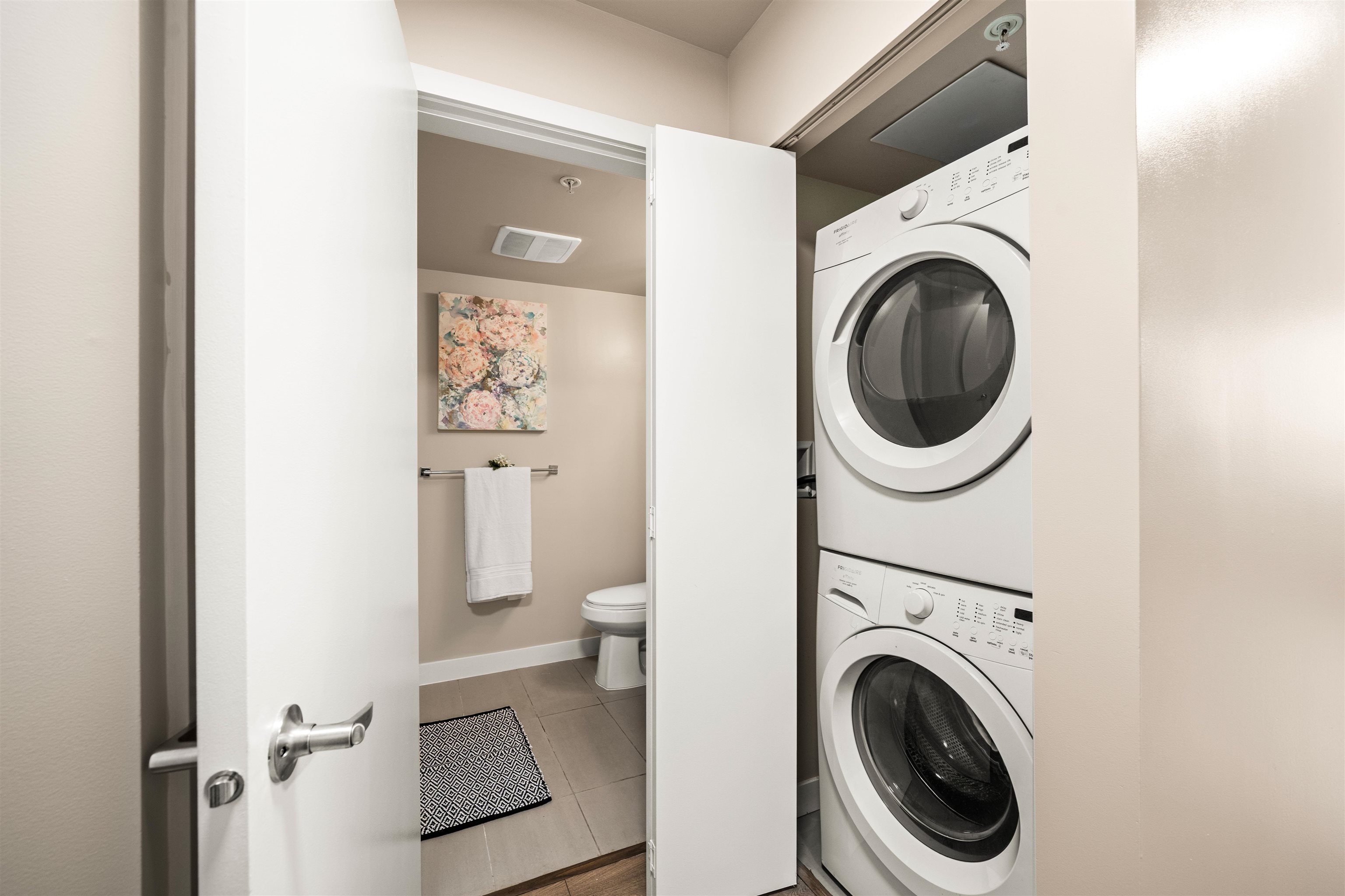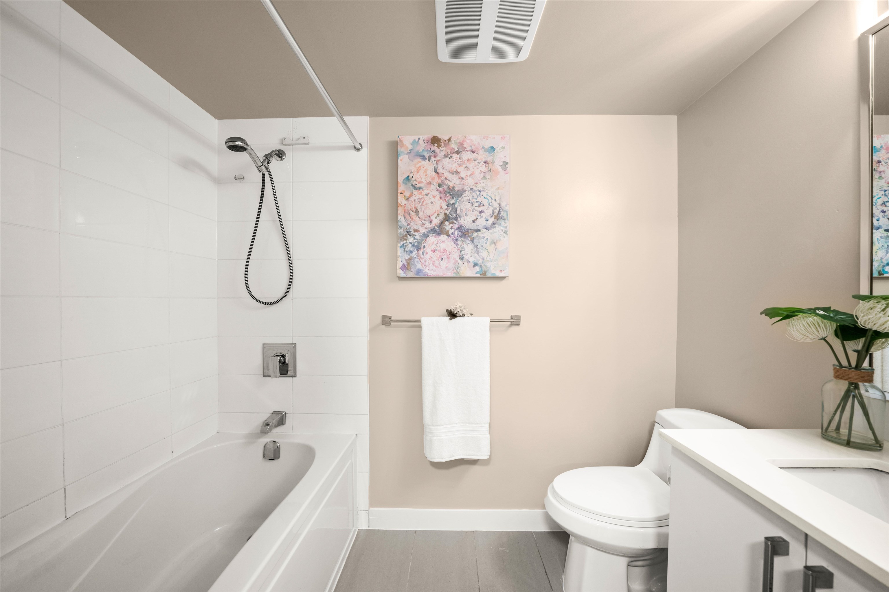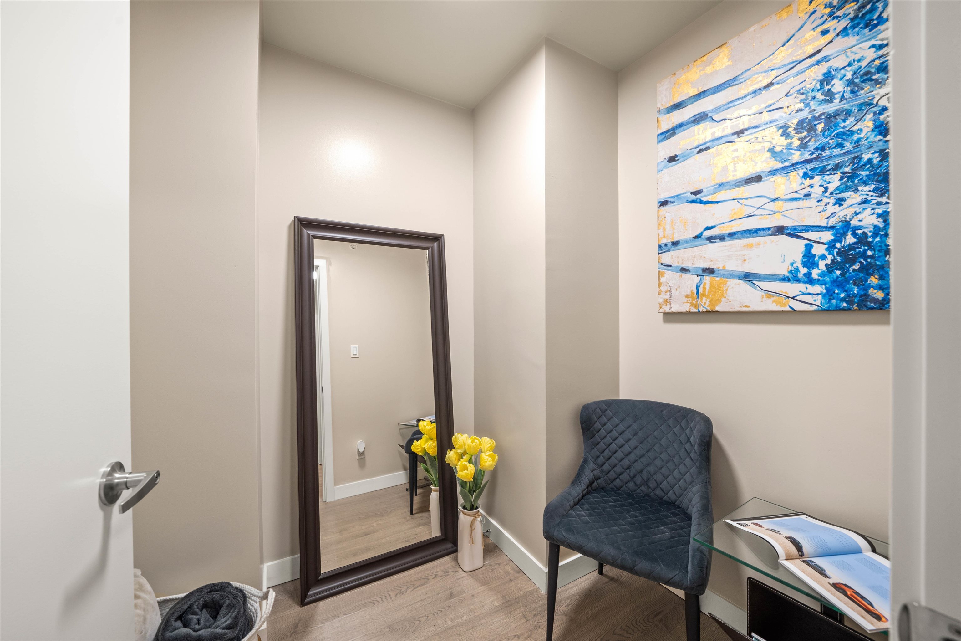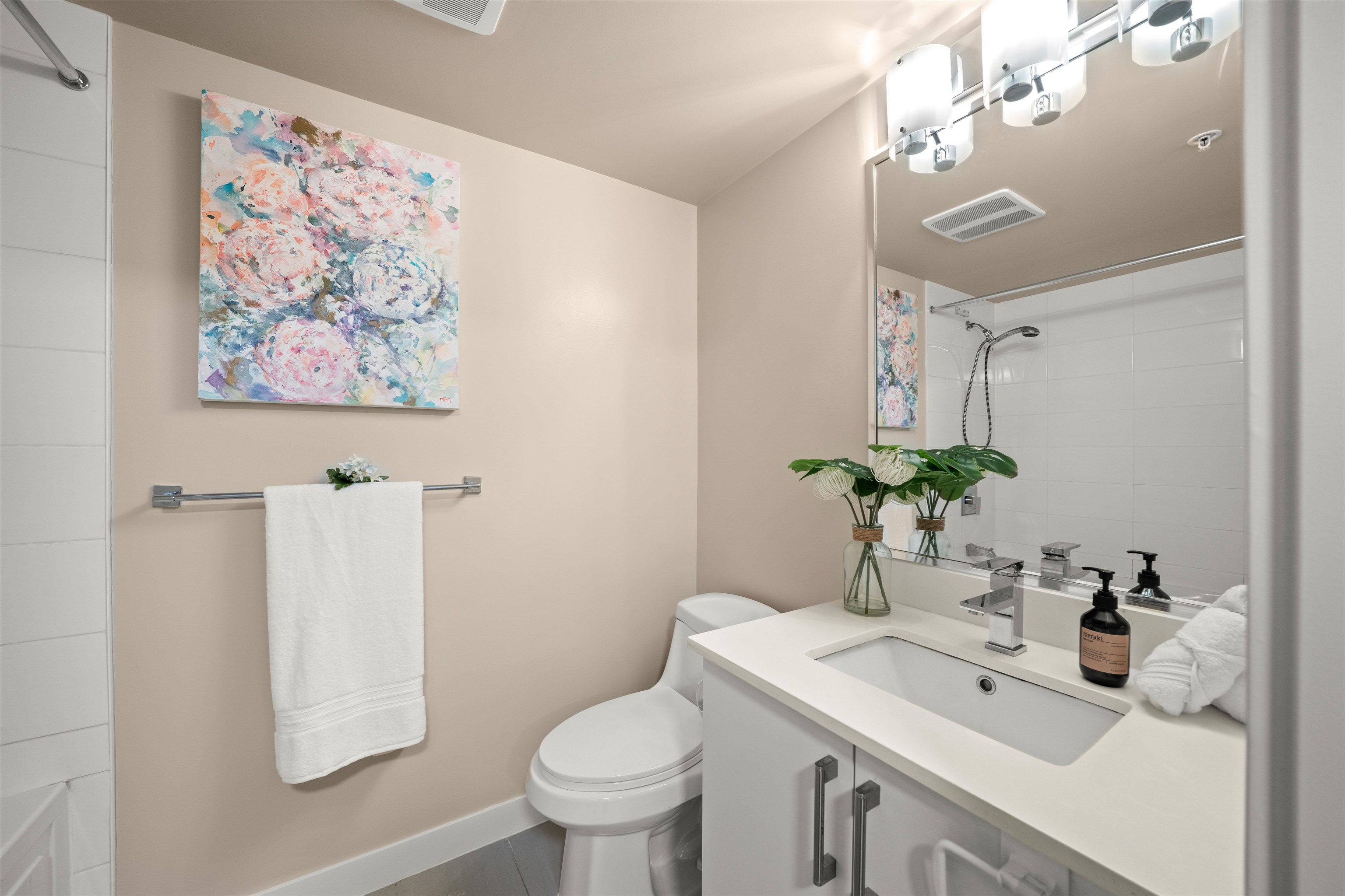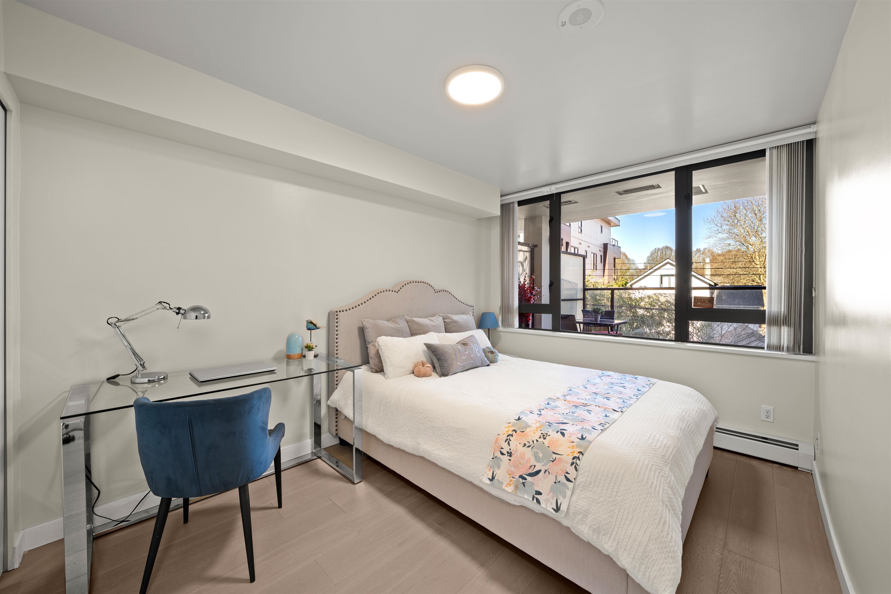 Prime location alert! This exceptional 1 bedroom, 1 den unit is QUIET and peaceful, situated away from the main road. Step onto the expansive balcony (181 sqft), perfect for entertaining guests and your own enjoyment, completing a total space of 715 sqft. The functional open layout showcases an excellent kitchen equipped with S/S appliances & Quartz countertops. New upgrades include freshly painted walls, new light fixtures, and newer laminate floors in the bedroom. Only steps away from the main bus lines (#19, #33, #29), 29th Ave Skytrain station, Norquay Park, restaurants, and schools. Enjoy easy access to Downtown and Metrotown, both reachable within 15 minutes. 1 OVERSIZED parking included!